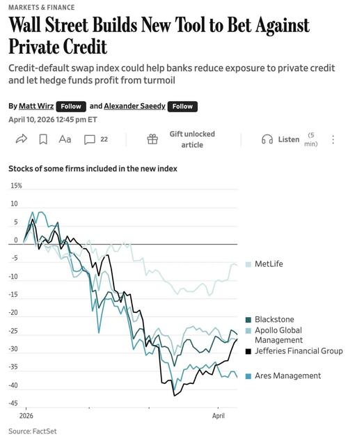 The Wall Street Journal wrote yesterday that banks like JPMorgan Chase, working with S&P Global, are rolling out a brand-new shiny instrument: a credit-default swap index tied to private credit exposure. A clean, tradable, scalable way to bet against the very ecosystem they spent the last decade inflating. They’re packaging up the risk, labeling it, and selling access to its failure.