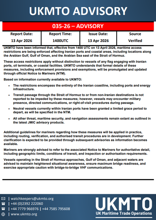 "These access restrictions apply without distinction to vessels of any flag engaging with Iranian ports, oil terminals, or coastal facilities," UKMTO said of the threatened blockade.