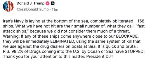 Soon after the blockade having taken effect, Trump issued a Truth Social message warning that if any of Iran's ships - which he says at this point are merely small 'fast attack ships' - come "anywhere close to our blockade, they will be immediately eliminated." He described this will be "the same system of kill that we use against the drug dealers" - in reference to the Caribbean and prior Venezuela operations.