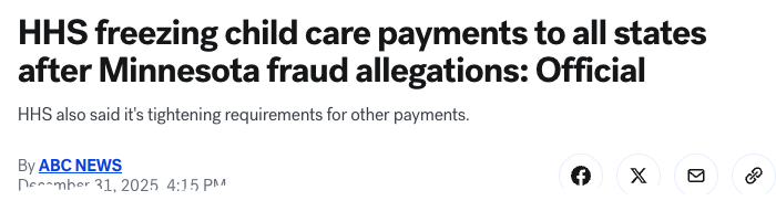 ABC News was the first to report HHS' move to cut all federal funding to daycares nationwide until operators can prove their legitimacy.