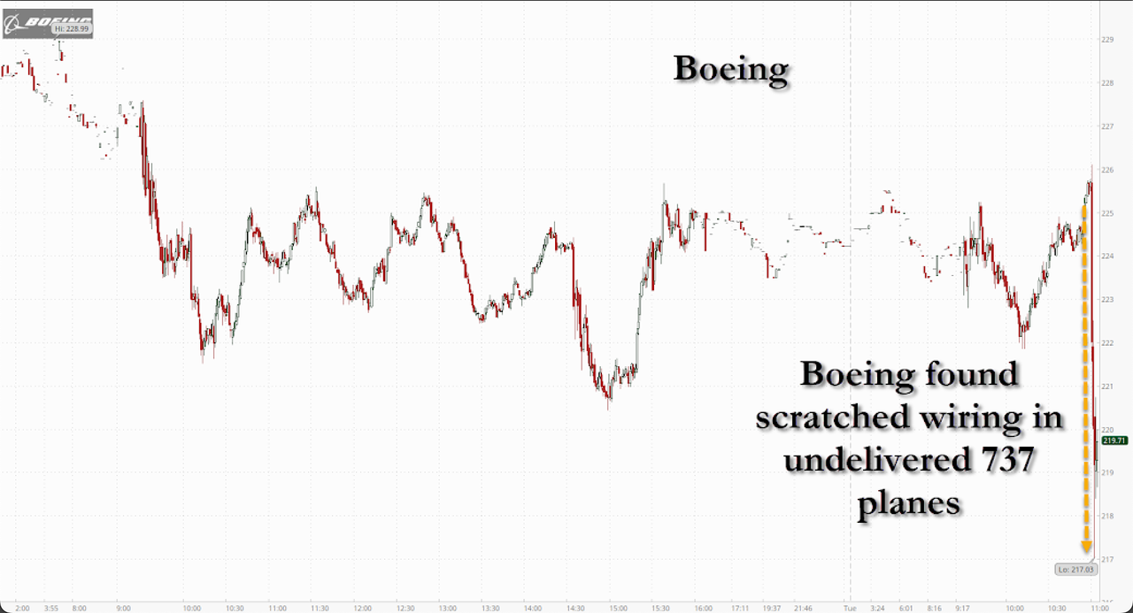 Boeing shares fell a little more than 3% in late-morning trading in New York after a new report from The Wall Street Journal stated that deliveries of some narrow-body 737 MAX jets would be delayed following the discovery of scratched wiring on newly built aircraft.