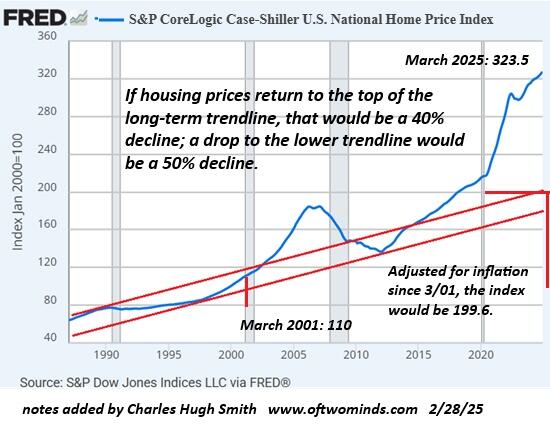 The Federal Reserve added over $3 trillion to its balance sheet after the 2008-09 Global Financial Meltdown. That didn't automatically create $3+ trillion in productive uses for this tsunami of credit-money. Private banks also create money with keystrokes: when a lender originates a mortgage, that credit-money is created out of thin air. This is "the way the world works" because this new credit-money is based on the collateral of whatever property is being mortgaged.