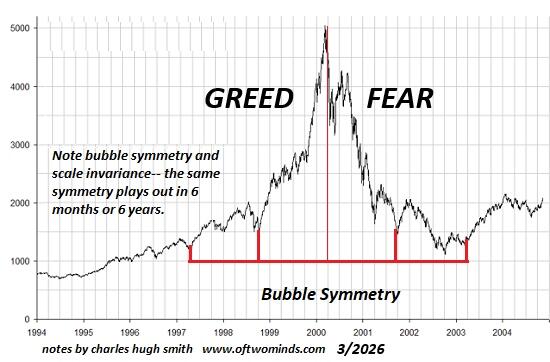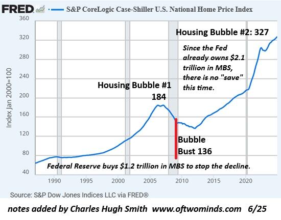 The Federal Reserve reversed the decline of valuations in Housing Bubble #1 by socializing the mortgage market , buying up $1+ trillion in mortgage backed securities (MBS). The Fed now owns over $2 trillion in MBS, so when Housing Bubble #2 (2020-2026) bursts, they won't be able to ride to the rescue. The asymmetries of scale will succumb to gravity.