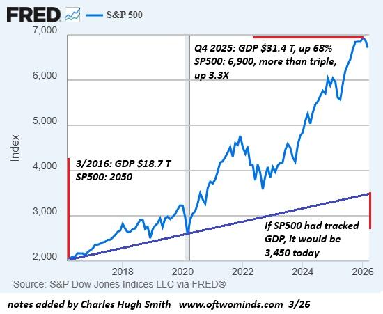 Here is a chart of the S&P 500 stock market index (SPX). Absent the injection of trillions in credit and the resulting credit-asset bubble, stocks would be expected to track the economy, i.e. GDP. If stocks had tracked GDP growth, the SPX would be roughly half its current lofty level: 3.450 rather than 6,800.
