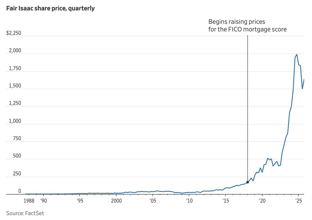To limit the bureaus’ influence, FICO changed strategy and enabled “tri-merge resellers” to generate scores using the company’s algorithm. That move cut out the bureaus and shifted profits toward FICO, driving its stock higher and theirs lower. In response, the bureaus began offering VantageScore for free on many loans.