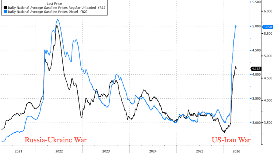 The $4 gasoline price level is politically sensitive, but meaningful demand destruction typically does not begin until prices approach $5. Still, the recent fuel price shock is the largest on record for both types of fuel.