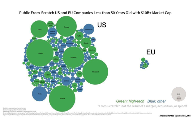 This widening economic gap cannot be explained by demographics . Instead, it reflects stronger productivity growth in the US, largely owing to technological innovation and higher total factor productivity. Today, roughly half of the world’s 50 largest technology firms are American, while only four are European . Over the past five decades, 241 US firms have grown from startups into companies with market capitalizations of at least $10 billion, compared with just 14 in Europe.