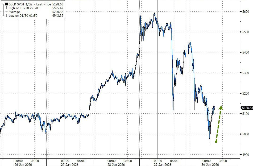 On the topic of commodities, the rally in precious metals finally showed signs of reversing. Initially, gold prices had looked set for a further gain, reaching an all-time intraday record of $5595/oz as we were going to press yesterday. However, they then sharply reversed course after the US open, plummeting down to $5,106/oz, before paring back those losses to close “only” -0.77% lower on the day at $5,375/oz. So that ended a run of 8 consecutive daily gains for gold, which had been the biggest 8-day advance since Lehman Brothers’ collapse in 2008, at +17.9%. It was a similar story for silver too, which slipped back -0.86% from its record high but a much better close than the -8.4% fall intraday.