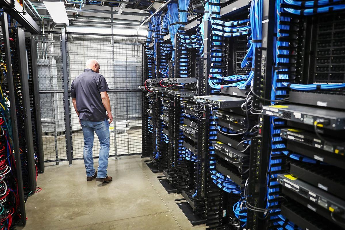 A worker walks among racks and network switches at the LightEdge Solutions data center in Altoona, Iowa, on Oct. 15, 2019. Joe Raedle/Getty Images
